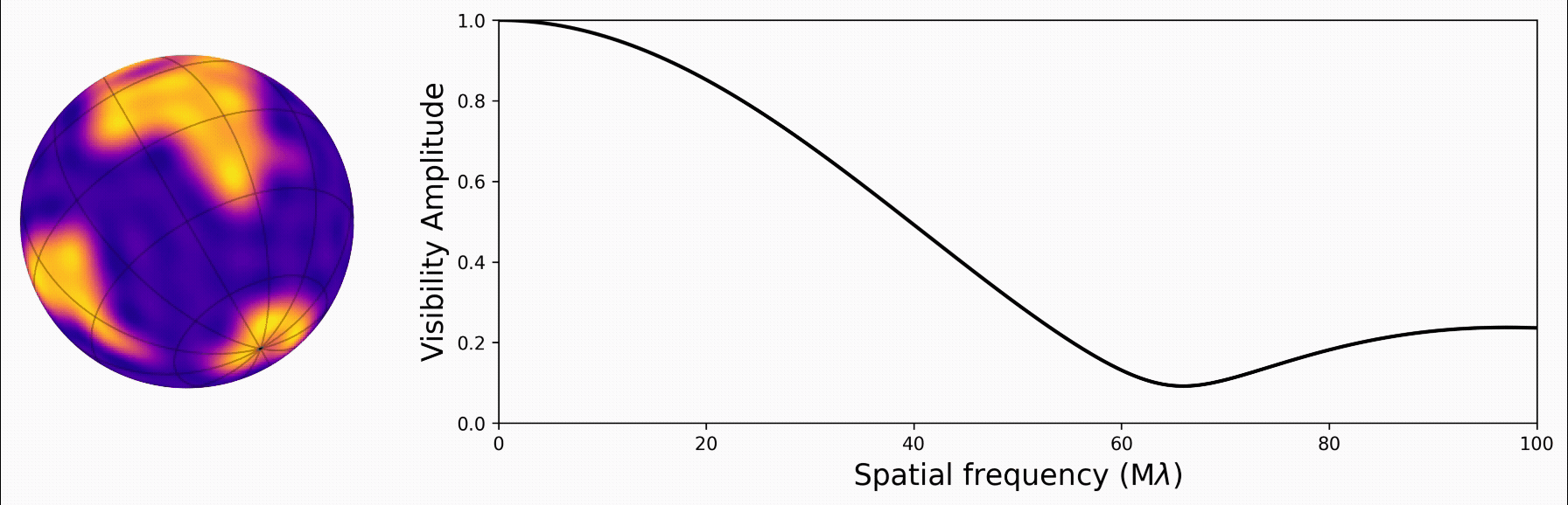With the star’s map described in spherical harmonics, we found a really neat analytic solution to its Fourier transform. This gives us the visibility function, which is closely related to what we measure from an interferometer. And the solution is linear with respect to the star’s map!