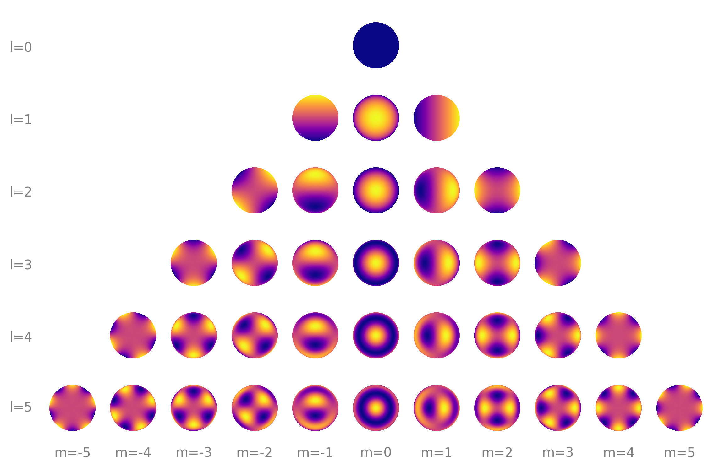 We can use our knowledge that our star has a spotty surface on a disk to reduce the number of solutions to our problem. If we know the star is rotating, we know the features on its surface will rotate along with it! In our paper, we use the spherical harmonics to represent the intensity on a star’s surface (figure from Luger et al. 2019: